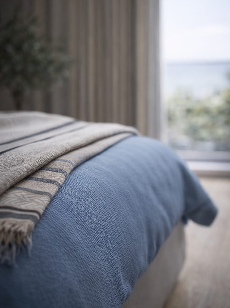 Die Räume wurden zunächst klar zoniert: Wohn-, Ess- und Schlafbereiche erhielten eindeutige Funktionen und ruhige visuelle Schwerpunkte. Durch eine reduzierte Farbpalette aus warmen Naturtönen, Holz und weichen Textilien entstand eine entspannte Grundstimmung, die den Blick nach draußen bewusst unterstützt, statt mit ihm zu konkurrieren.